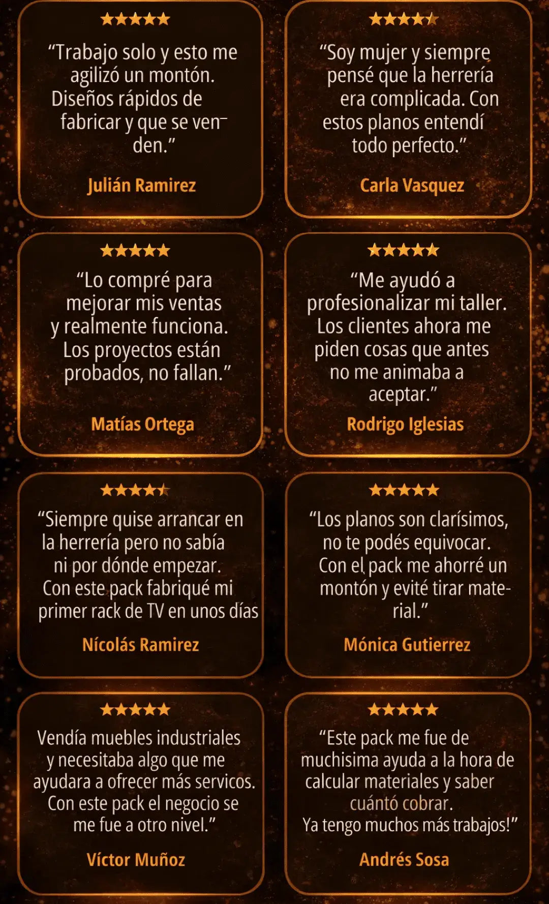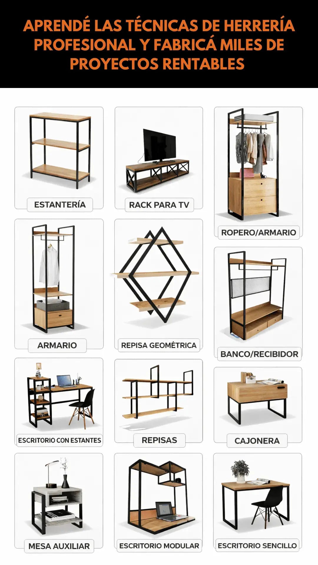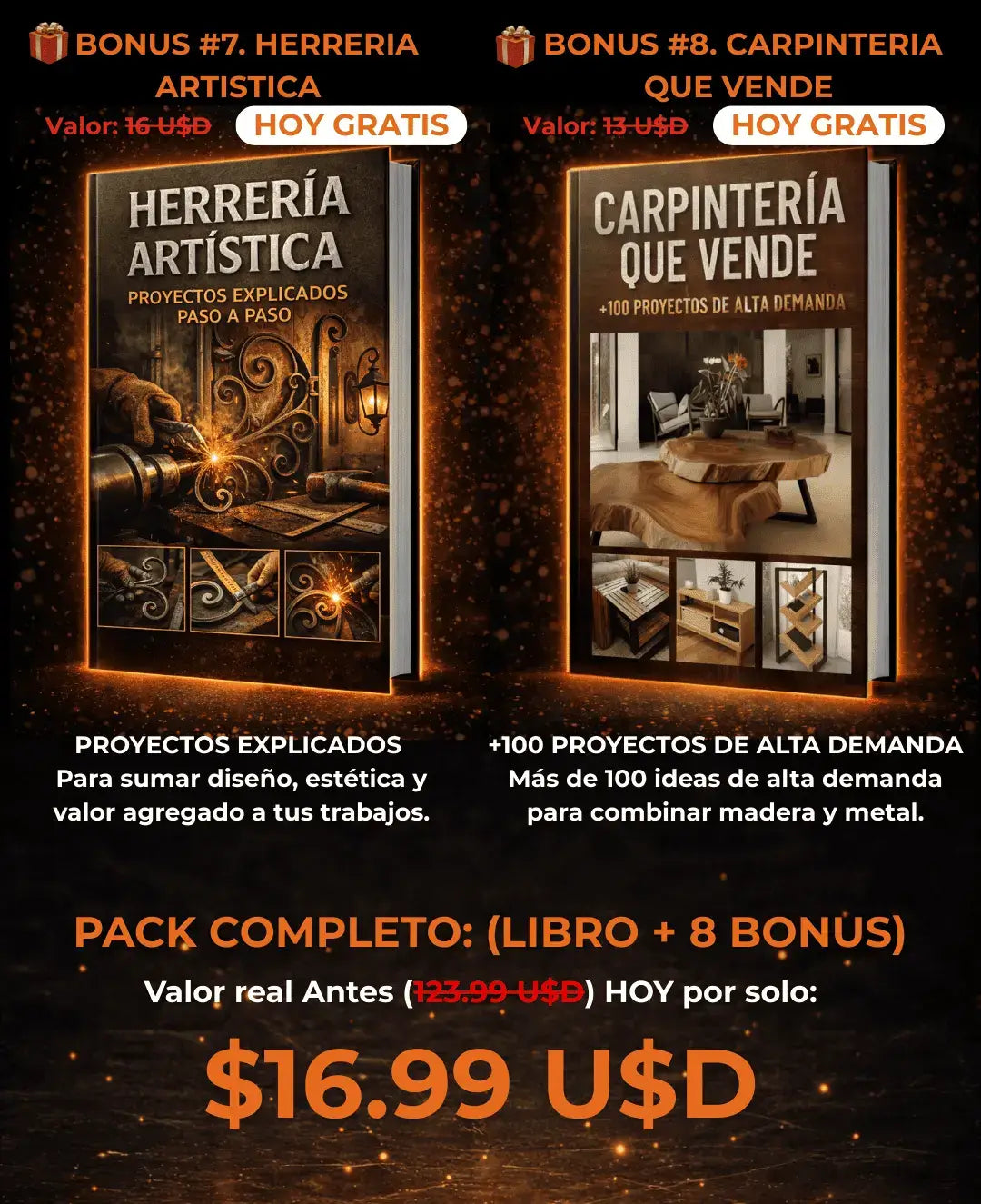 El sistema incluye más de 600 diseños metálicos listos para fabricar, con planos técnicos de medidas exactas, cortes optimizados, armado paso a paso y listas de materiales pensadas para ahorrar tiempo y dinero.