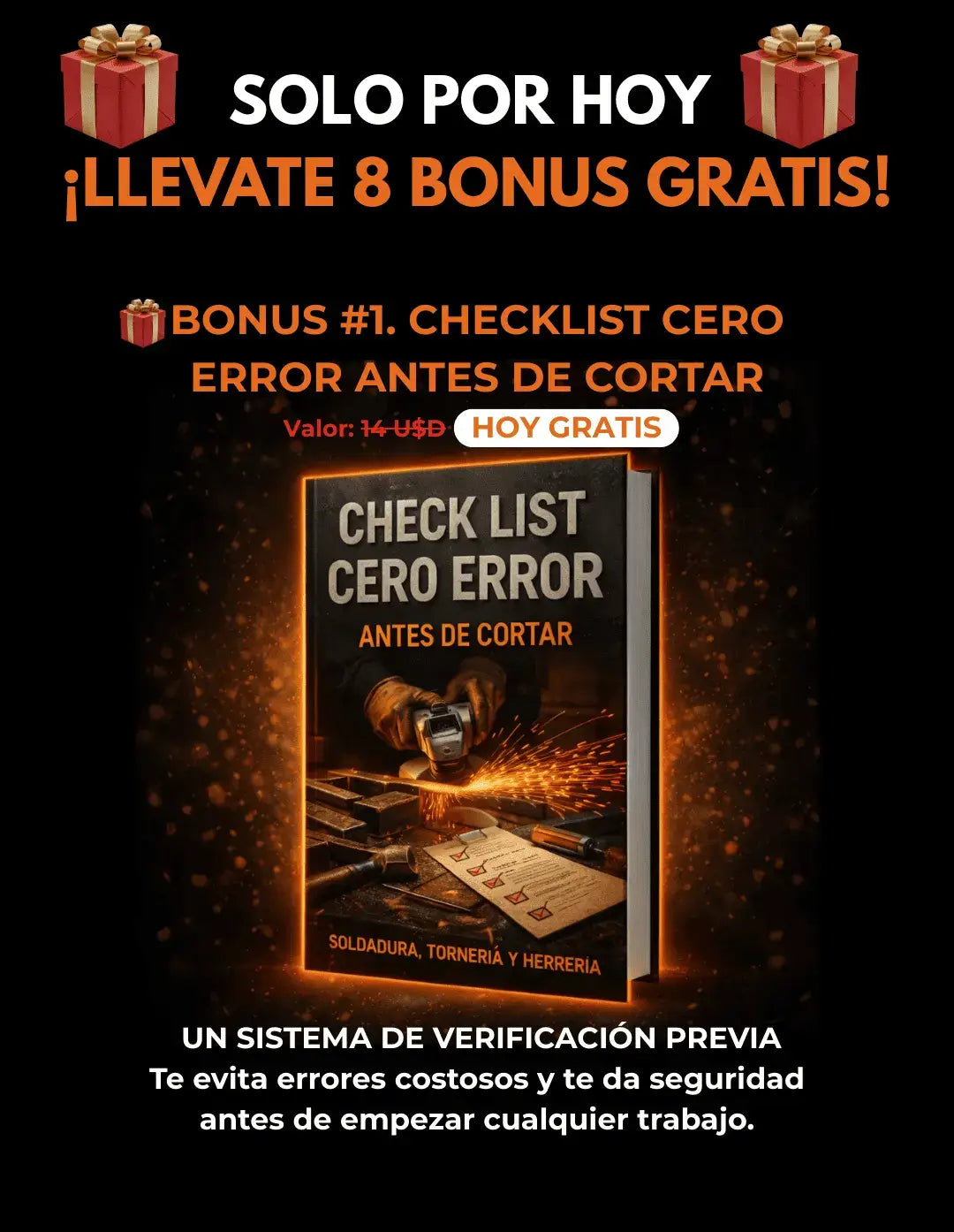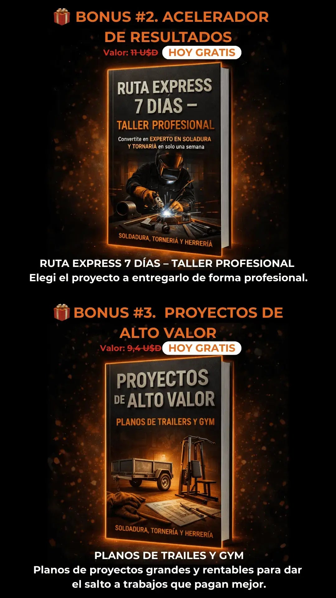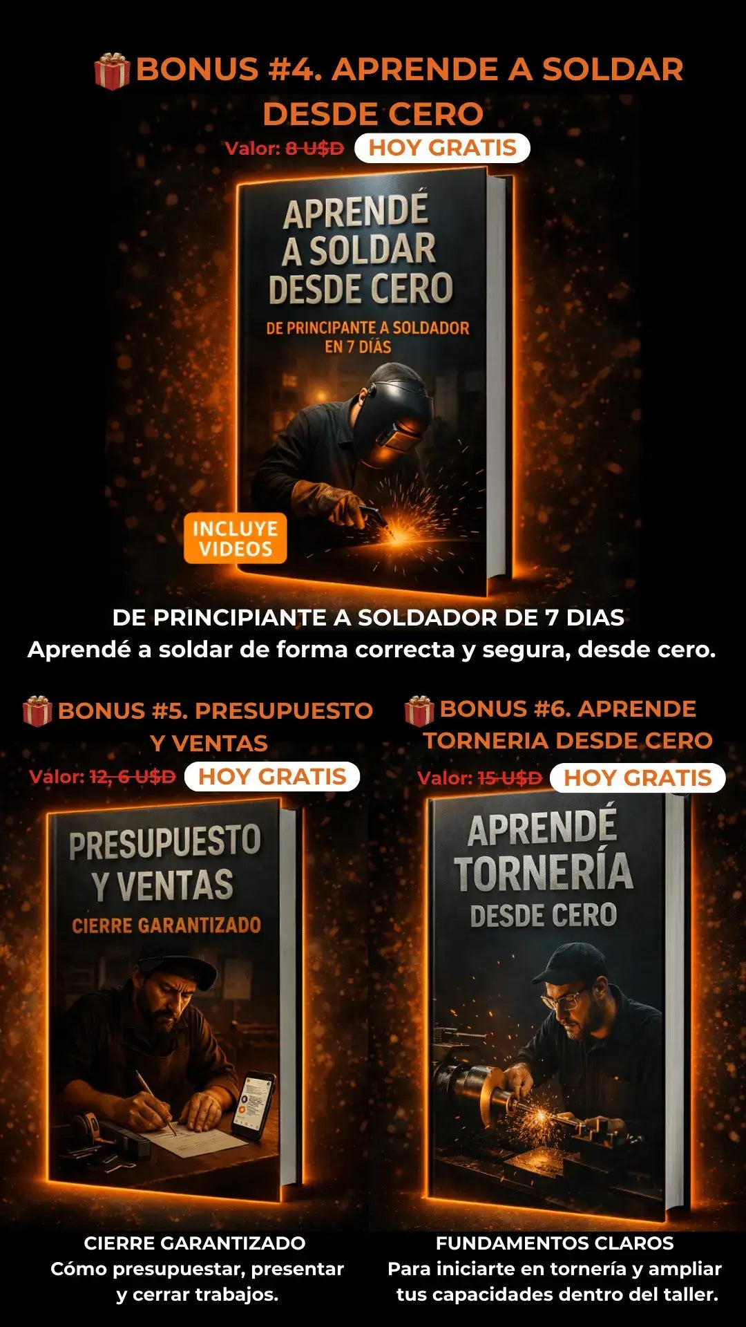 Además, accedés al Motor de Presupuestos Profesionales™, el Mapa Maestro del Taller™ y 8 bonus donde aprendés soldadura, herrería artística, tornería, carpintería metálica y proyectos de alto valor comercial.